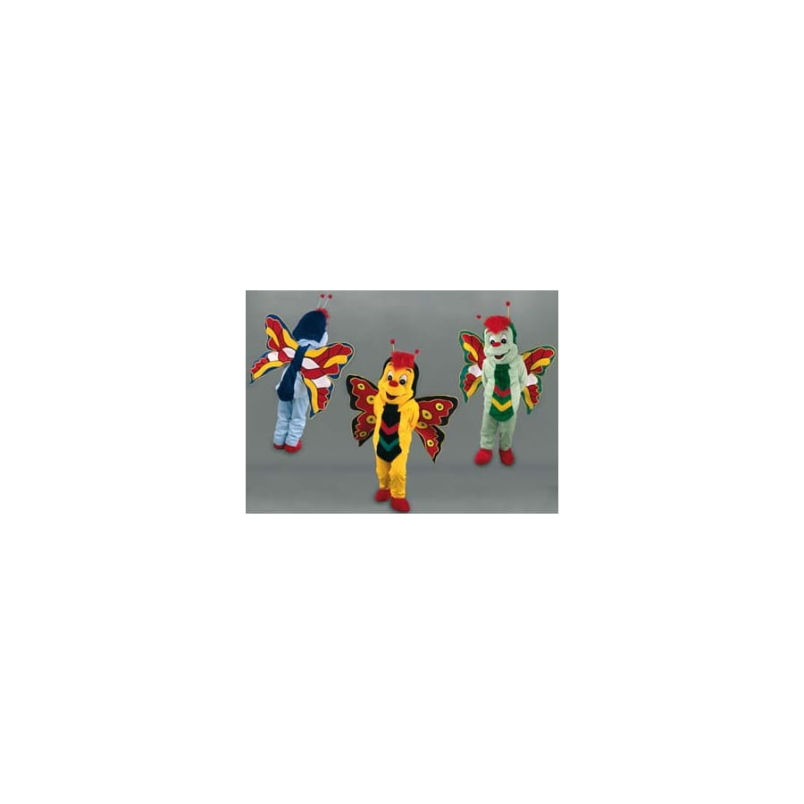 Ce déguisement de mascotte est composé de gants, de sur-bottes (chaussures à mettre au dessus de chaussures traditionnelles), du corps avec les ailes de papillon et de la grosse tête. De taille unique (pour personne de 1m60 à 1m90), cette mascotte se décline en divers coloris.