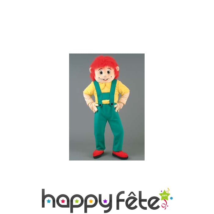 Costume mascotte de petit garçons au cheveux roux et portant une salopette verte, un t-shirt jaune et des chaussure rouge. Le costume est disponible en taille unique (1m60 à 1m90), respecte les normes CE de sécurité et est difficilement inflammable. Très confortable et construit avec éléments mous, il est idéal pour des évènements ou des animations. Une personnalisation sur demande de devis est possible.