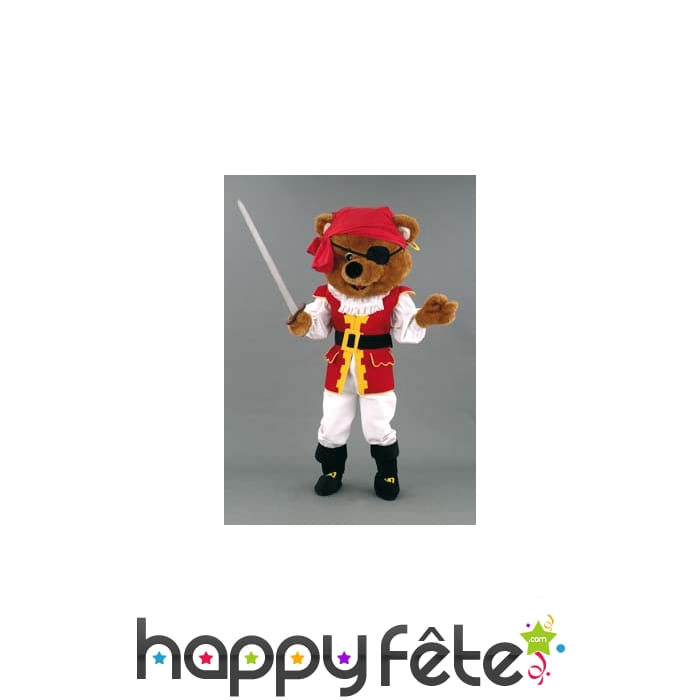 Ce déguisement de mascotte est composé des gants en formes de pattes, du corps habillé en pirate, des sur-chaussures noires (chaussures à mettre au dessus de chaussures traditionnelles) et de la grosse tête d'ours revêtue d'un bandana rouge ainsi que d'un cache oeil. Ce déguisement de taille unique convient aux personnes mesurant de 1m60 à 1m90.