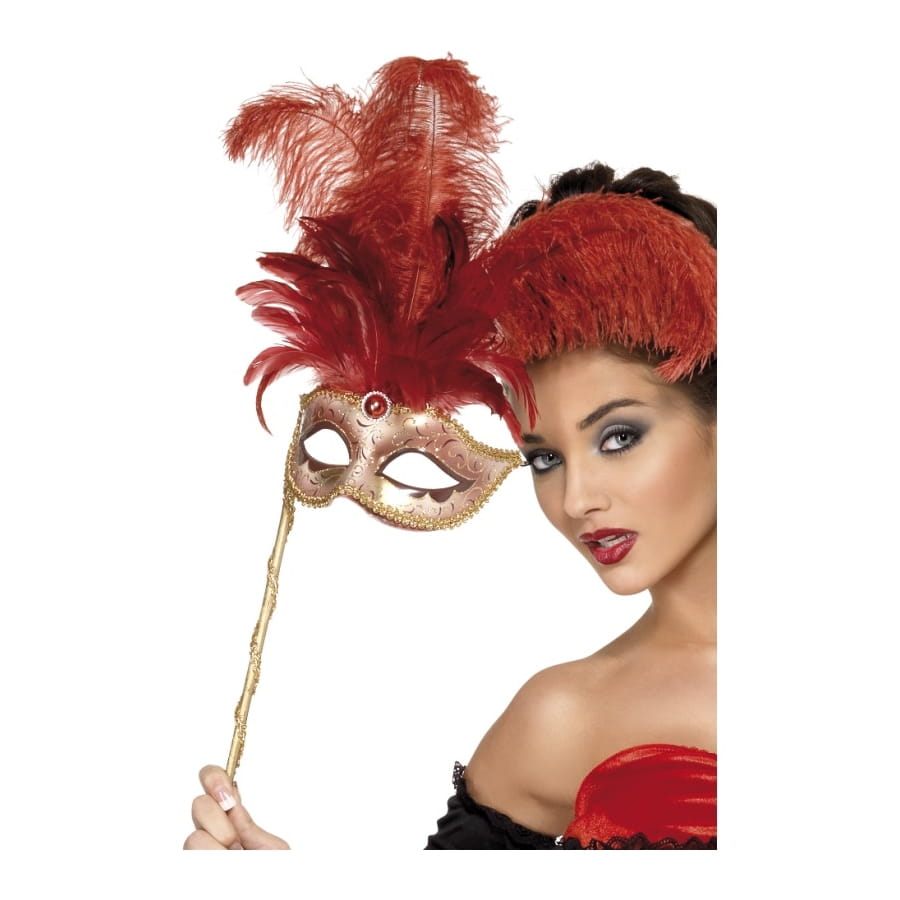 Magnifique masque baroque fantaisie de couleur dorée et rouge, pour femme. Très glamour, ce masque est orné d'une multitude de superbes plumes rouges et possède un support pour le tenir. Il ajoutera élégance et mystère à votre déguisement.