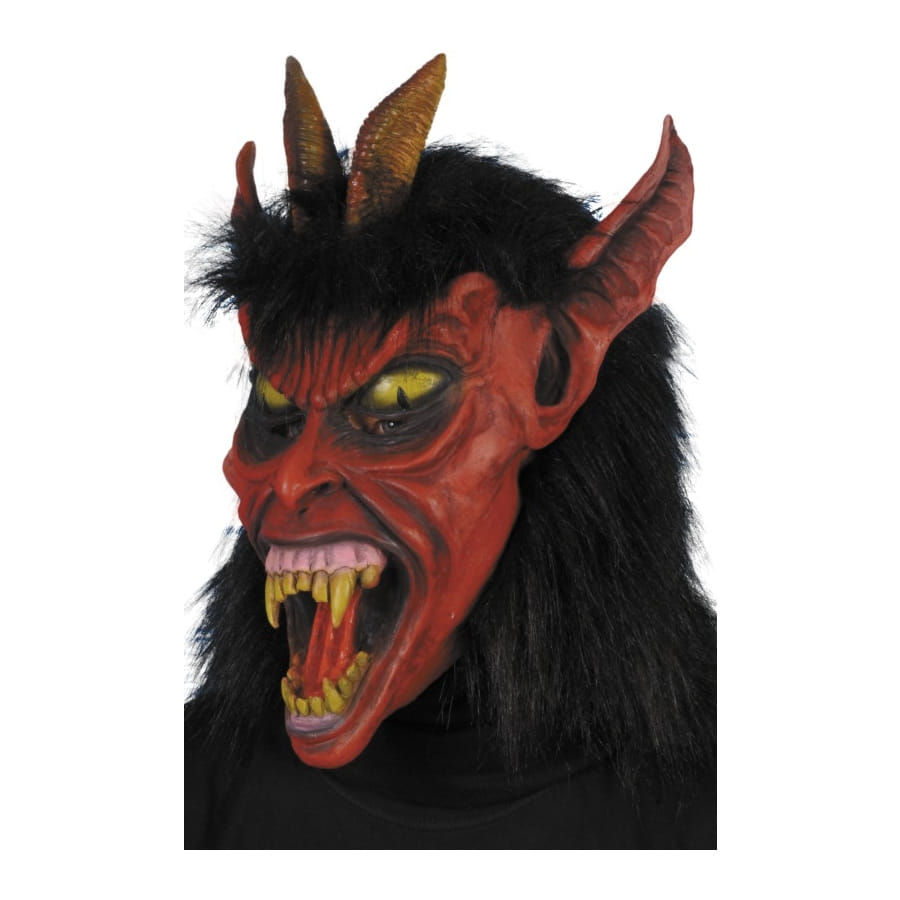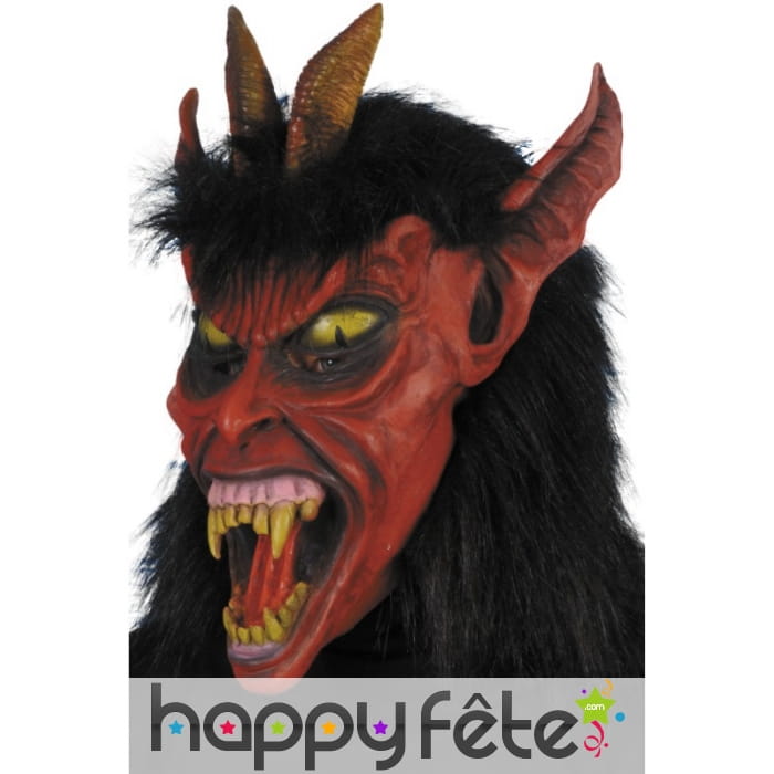 Masque de Belzébuth, de couleur rouge et jaune, pour homme ou femme. Le masque est composé de cheveux noirs, d'oreilles pointues, de cornes, de dents et de yeux jaunes. Il n'est pas conseillé de s'aventurer près des tout petits avec ce masque, vous risqueriez de trop les effrayer!