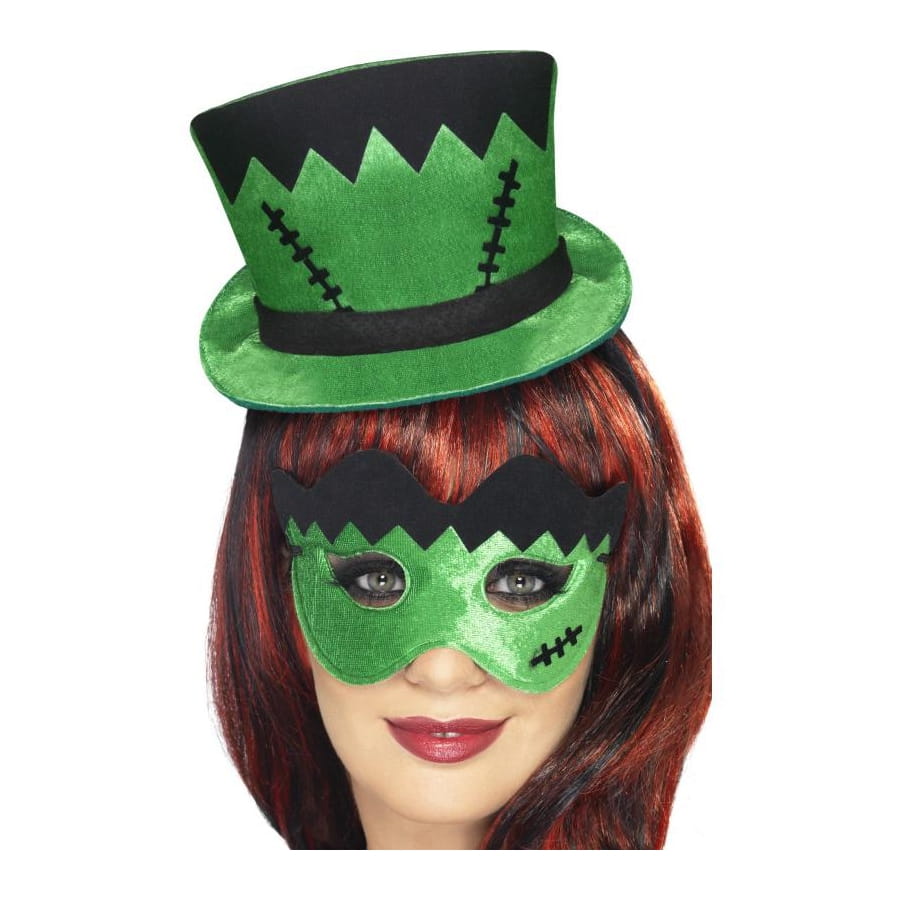 Déguisement, pour femme, constitué d'un haut-de-forme et d'un masque noirs et verts. Ils sont également ornés de petites cicatrices noires. Adaptez ce déguisement comme bon vous semble.