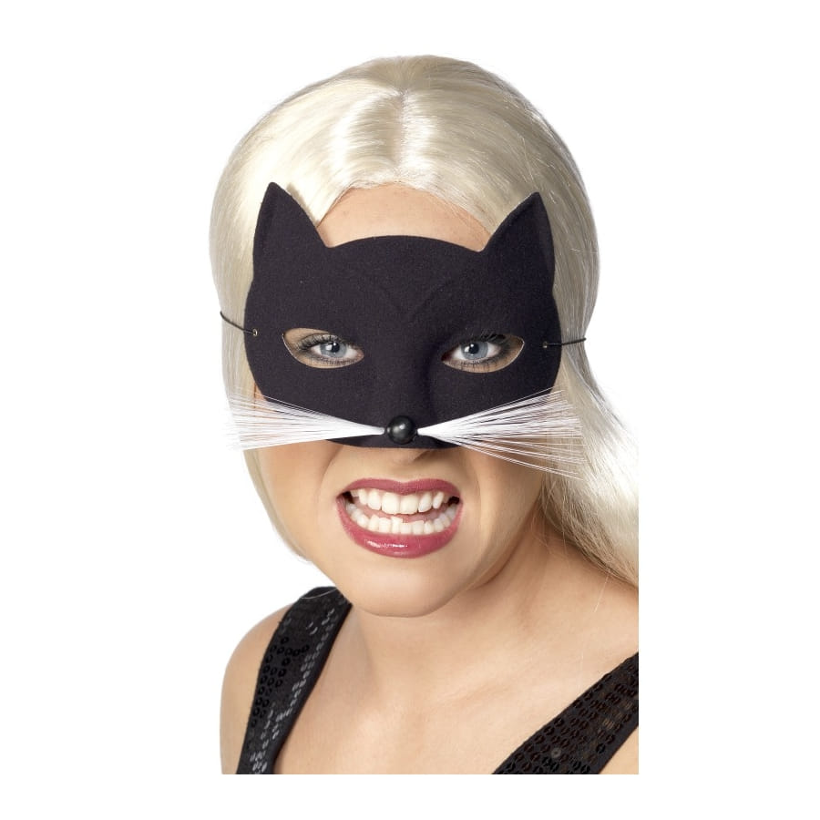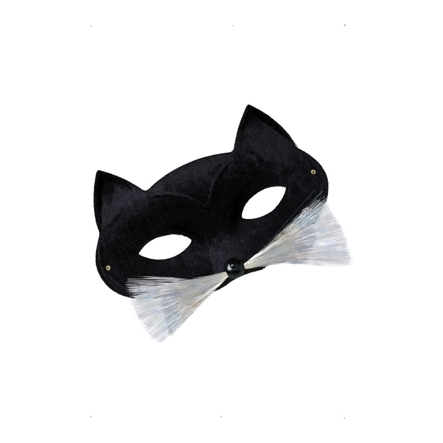 Masque de chat de couleur noire avec oreilles et museau, pour femme. Le masque recouvre uniquement la moitié du visage et comporte des moustaches blanches. Il est idéal pour un déguisement de chat ou pour un bal masqué.
