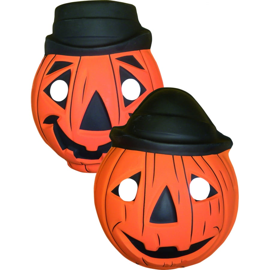 Masque de citrouille rigide, de couleur orange avec chapeau de couleur noire, pour enfant. Ce masque représente un excellent déguisement pour Halloween.