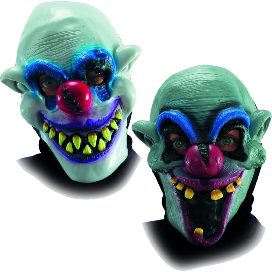 Masque intégral de clown d'horreur pour homme. Il existe 2 modèles de masques, l'un plus effrayant que l'autre. Lors de votre commande, il vous sera impossible de choisir le masque que vous souhaitez. Vous recevrez un des deux modèles. Ils comportent tous deux d'affreuses dents et un maquillage bleu et noir ainsi qu'un nez rouge.
