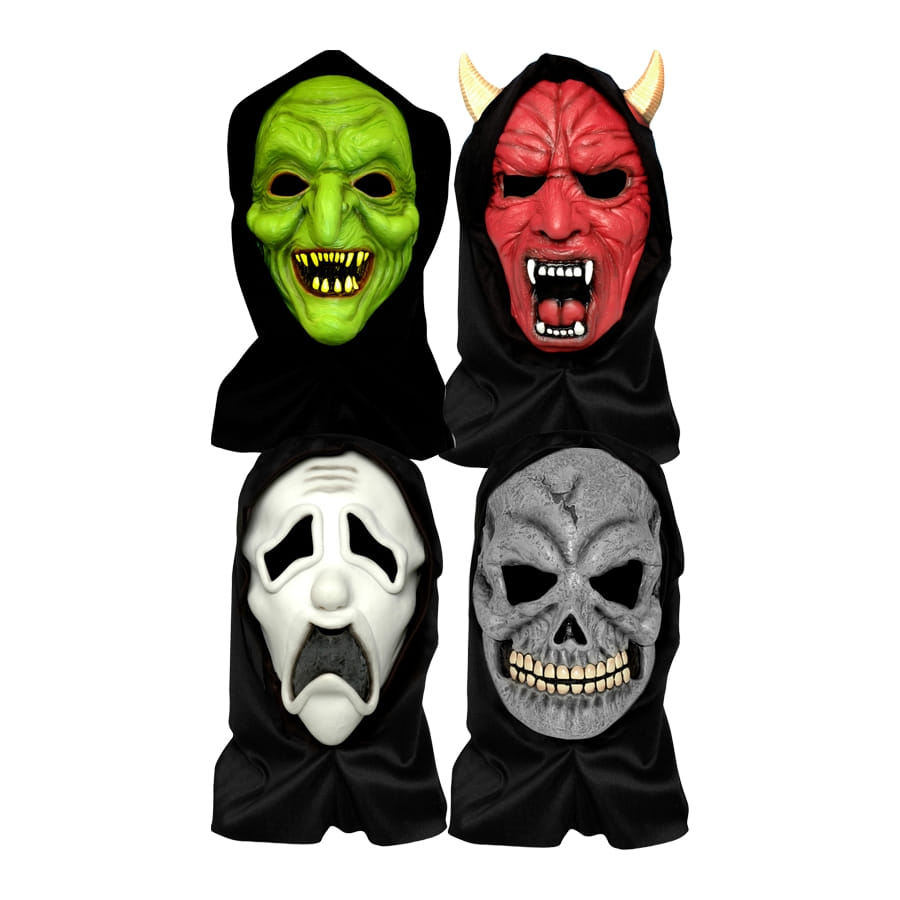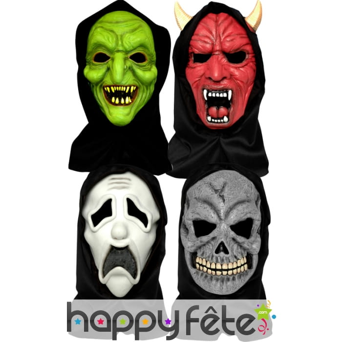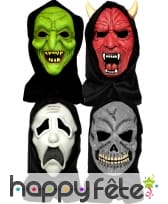 Déguisez-vous en affreux monstre encagoulé avec ces masques d'Halloween pour adultes. Les masques eux-mêmes recouvriront parfaitement votre visage, avec des ouvertures pour les yeux, tandis que la cagoule, de couleur noire, dissimulera votre tête et vos épaules. Ce masque existe en 4 modèles différents et la cagoule de celui de démon comporte des cornes. Au moment de votre commande, vous n'aurez pas le choix du modèle ni de la couleur et recevrez un des masques présentés.