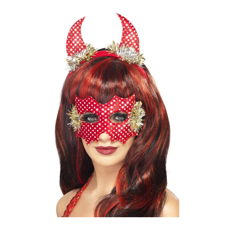 Masque et cornes de diablesse pour femme ou adolescente. Les deux accessoires sont de couleur rouge à pois blancs avec paillettes dorées. Elles complèteront parfaitement votre déguisement de diablesse pour Halloween.