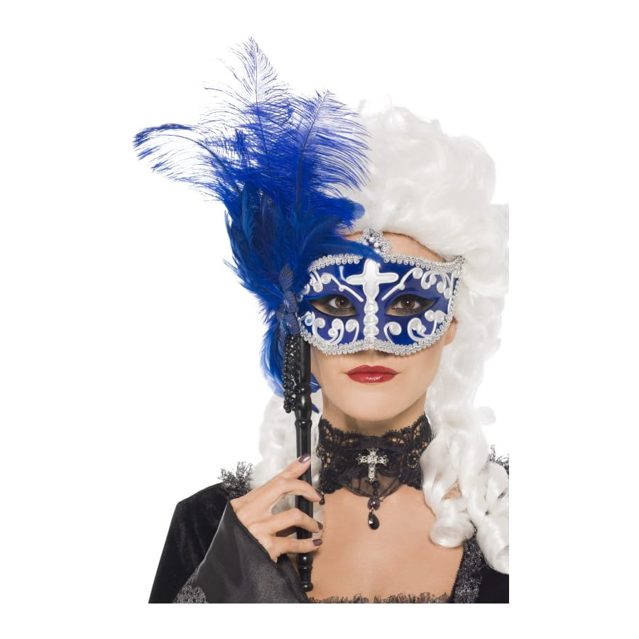 Adoptez un air mystérieux et séducteur pour votre bal masqué avec ce magnifique masque bleu et blanc. Le bâton sur lequel il est attaché contribuera à vous donner une apparence élégante parfaitement dans le thème de Venise.