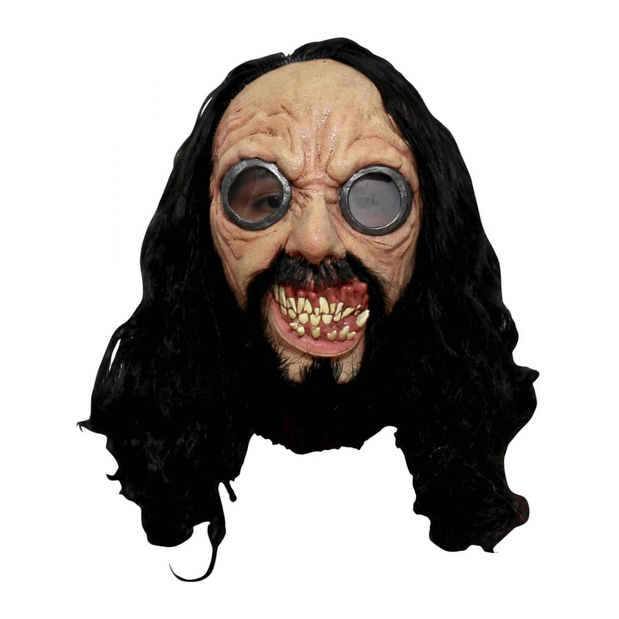 Avec sa longue chevelure synthétique brune, et 2 monocles effet métal, il illustre un visage défiguré avec une bouche pleine de dents mal alignées.