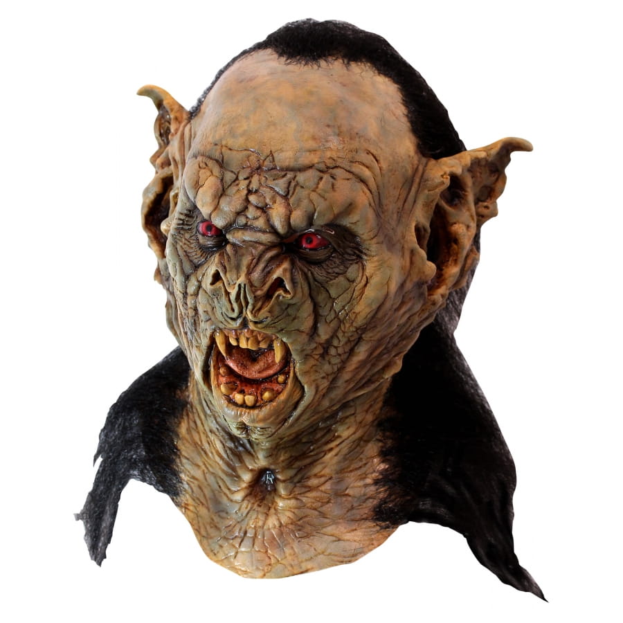 Les détails de ce masque sont remarquables avec des yeux rouges, une bouche pleine de dents jaunies, un nez et des oreilles atypiques, ainsi qu'une peau très plissée.