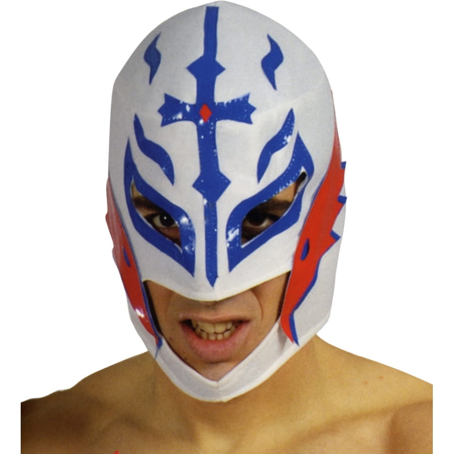 Masque blanc orné de flammes et d'une croix bleue. Cet accessoire est idéal pour faire de vous un vrai catcheur prêt au combat.