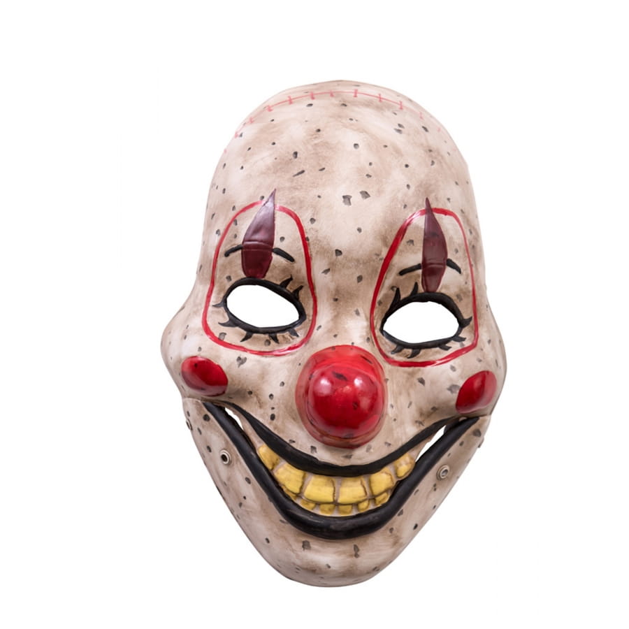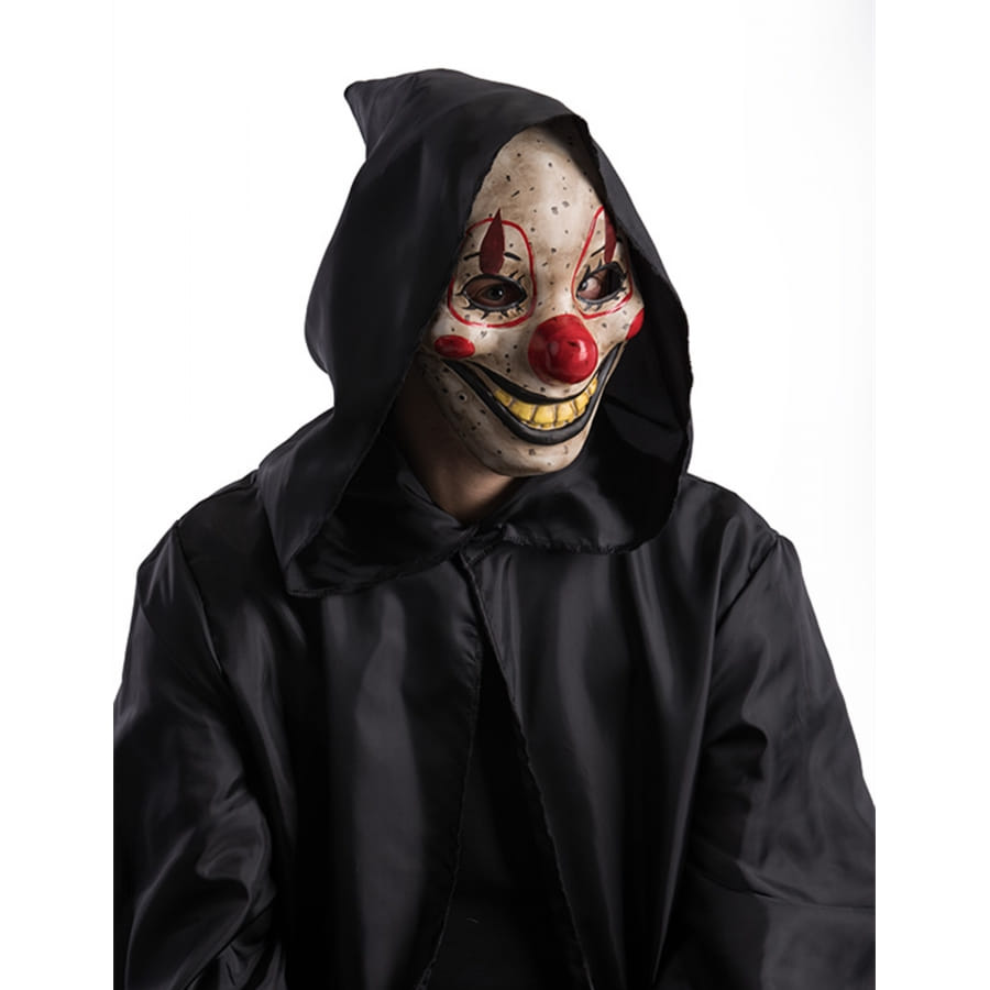 Le masque représente le visage d'un clown plein de verrues, avec une dentition jaunâtre et un regard effrayant.