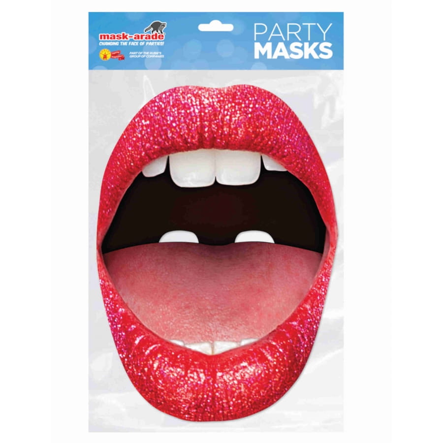 Ce masque est fait en carton et met en avant une bouche avec des lèvres rouges pailletées.