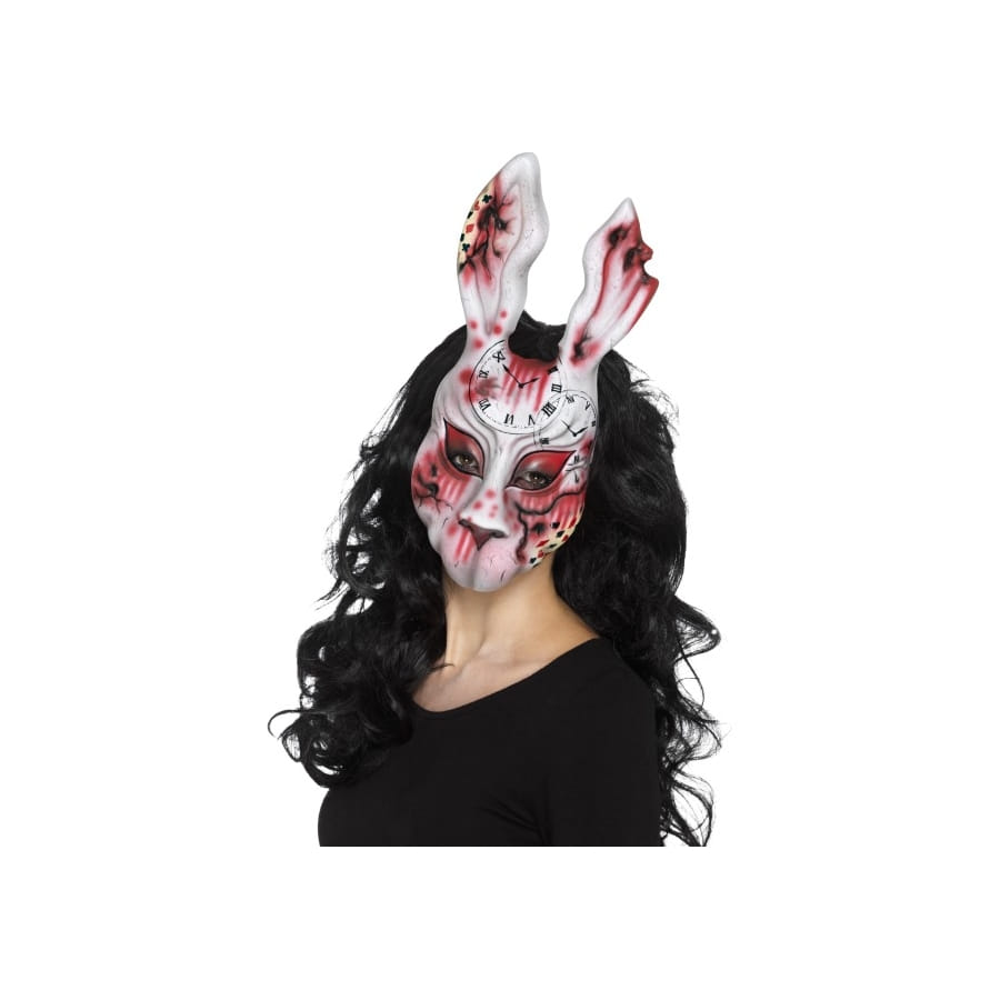 Pour la fête d'halloween, ayez de l'originalité dans votre costume grâce au masque de lapin diable. Ce curieux objet n'est autre que la reproduction de la face d'un lapin aux grandes oreilles. Cependant, l'autre oreille a été expressément coupée. Dans son ensemble, le masque est de couleur blanche, mais il porte des souillures de sang relatives à des blessures. Il est également couvert de motifs de cartes de jeu ainsi que de montres. Dans une idée du lapin de Alice au pays des merveilles en version Halloween.