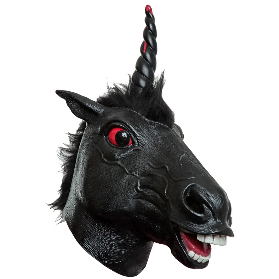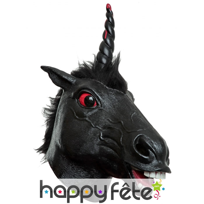 Ce masque en latex est de couleur noire et représente une tête de licorne gueule ouverte, avec la langue et les dents visibles.