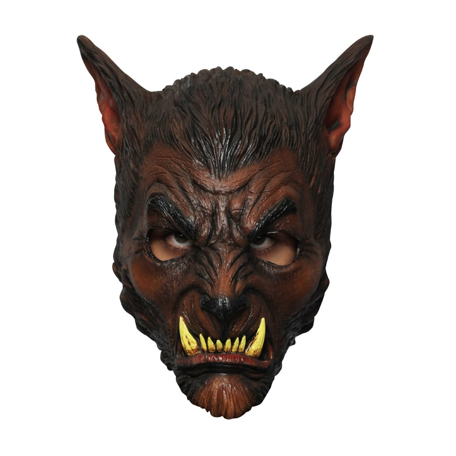 Avec ce masque que vous voyez ici, vous serez le plus méchant et le plus horrifiant de tous les loups garous. Il représente un loup garou brun hyper féroce, avec des longues dents pointues, prêtes à mordre. Ce masque est en latex, et recouvre toute la tête. Vous pourrez l'arborer le soir d'Halloween, pour terrifier les humains et les monstres, notamment les méchants vampires. Notez qu'il est de taille adulte.
