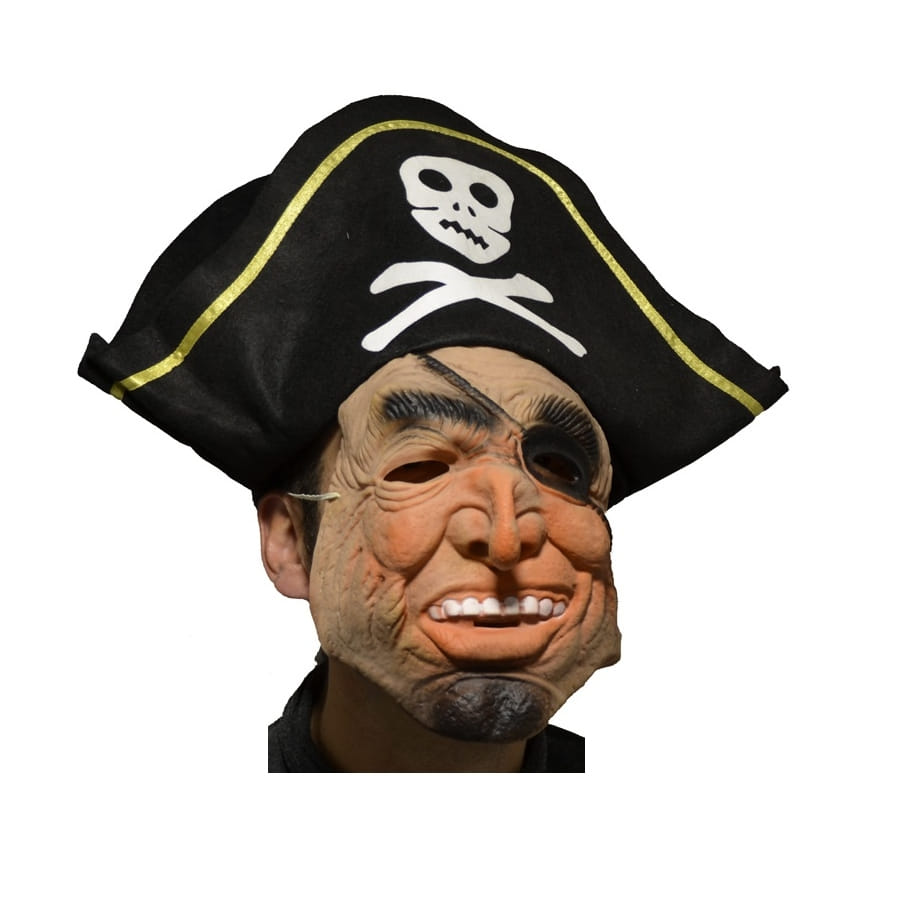 Votre beau visage bien rasé et bien propre ne convient pas au déguisement de pirate que vous avez l'intention de porter. Il va falloir vous cacher derrière un masque si vous voulez un déguisement réussi. Nous présentons ici un masque de pirate muni d'un chapeau, de couleur beige, avec un cache-oeil noir dessiné sur le masque, qui est facial et entièrement noir, avec une tête de mort blanche sur le chapeau. Le tout pour adulte.
