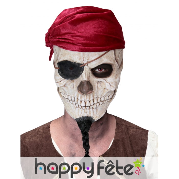 Ce masque est fabriqué à base de latex et représente un crâne blanc dont le cache-oeil noir et la barbichette tressée rappellent le visage d'un bandit des mers.