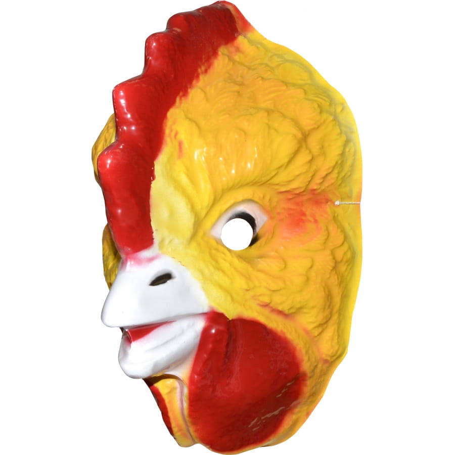 Entièrement fabriqué en plastique, ce masque pour adulte représente une tête de poule de couleur jaune et rouge.