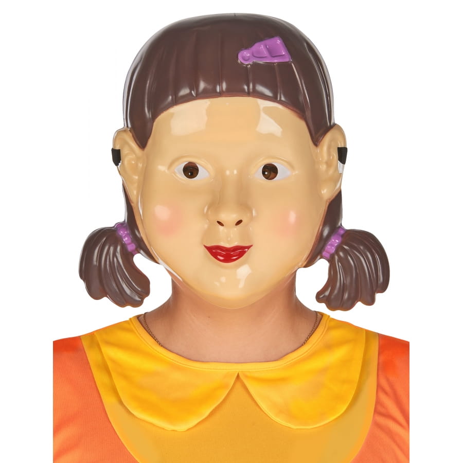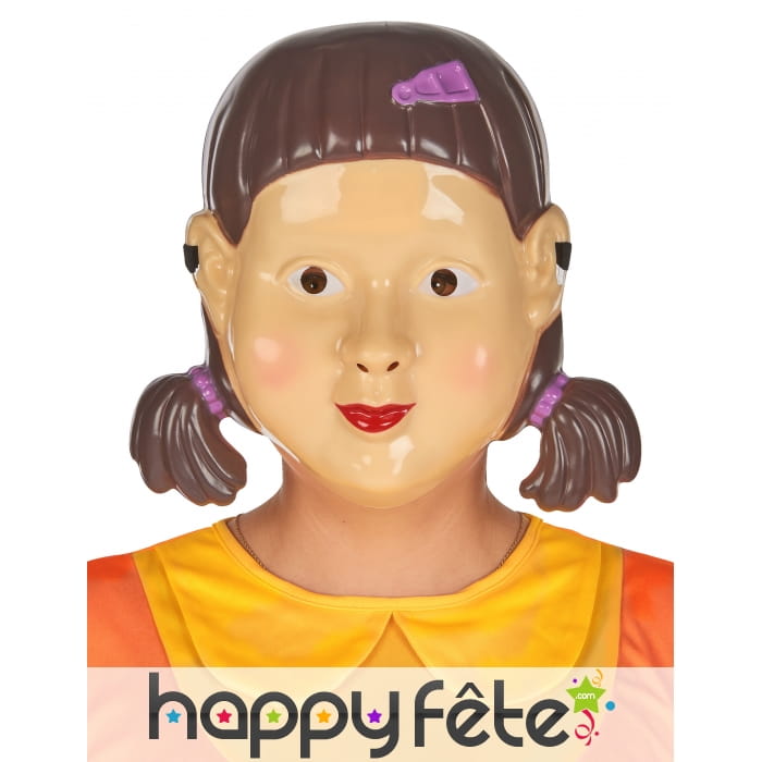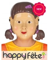 Ce masque représente une poupée au visage beige dépourvu de véritable expression, et ses cheveux marron foncé décoré de chichis et d'une barrette violets.