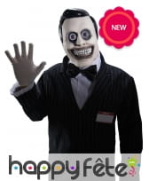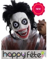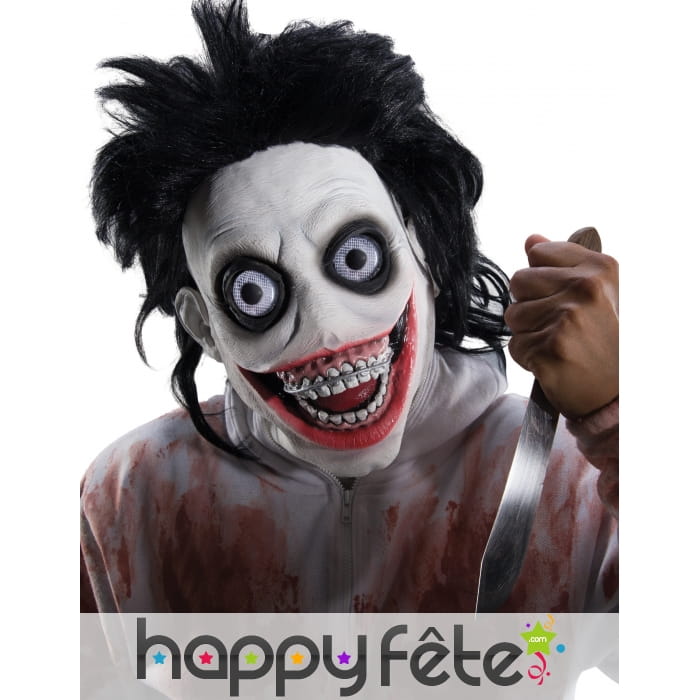 Il est agrémenté d'une perruque noire ma coiffée qui donne le ton à de grands yeux globuleux mis en avant par le maquillage noir fait sur le contour des yeux.