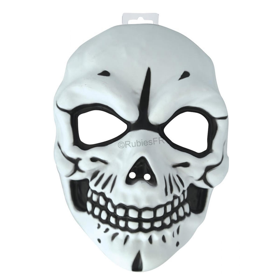 De couleur blanc, c'est l'illustration d'une face de squelette avec des détails noirs.