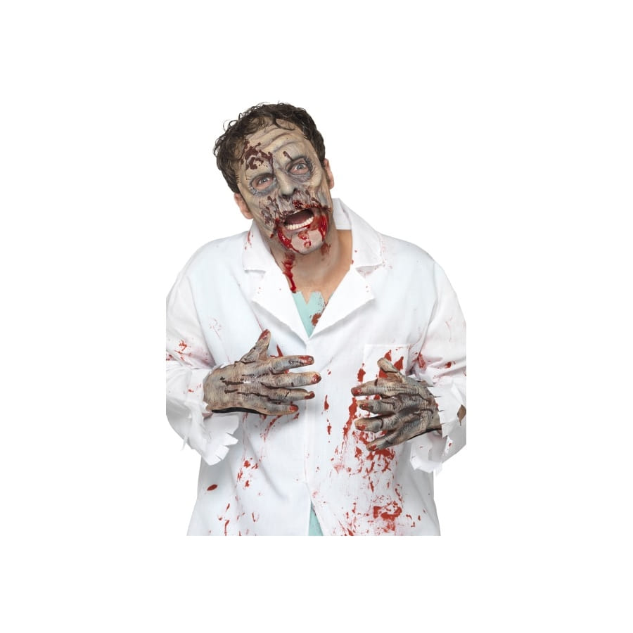 Vous pouvez constituer un déguisement de zombie avec seulement des accessoires. L'ensemble masque de zombie avec gants en latex est parfaitement approprié pour Halloween. Il s'agit d'accessoires de couleur beige et rouge. Votre personnage aura une tête toute défigurée avec du sang partout ! La paire de gants en latex est également tachetée de sang.
