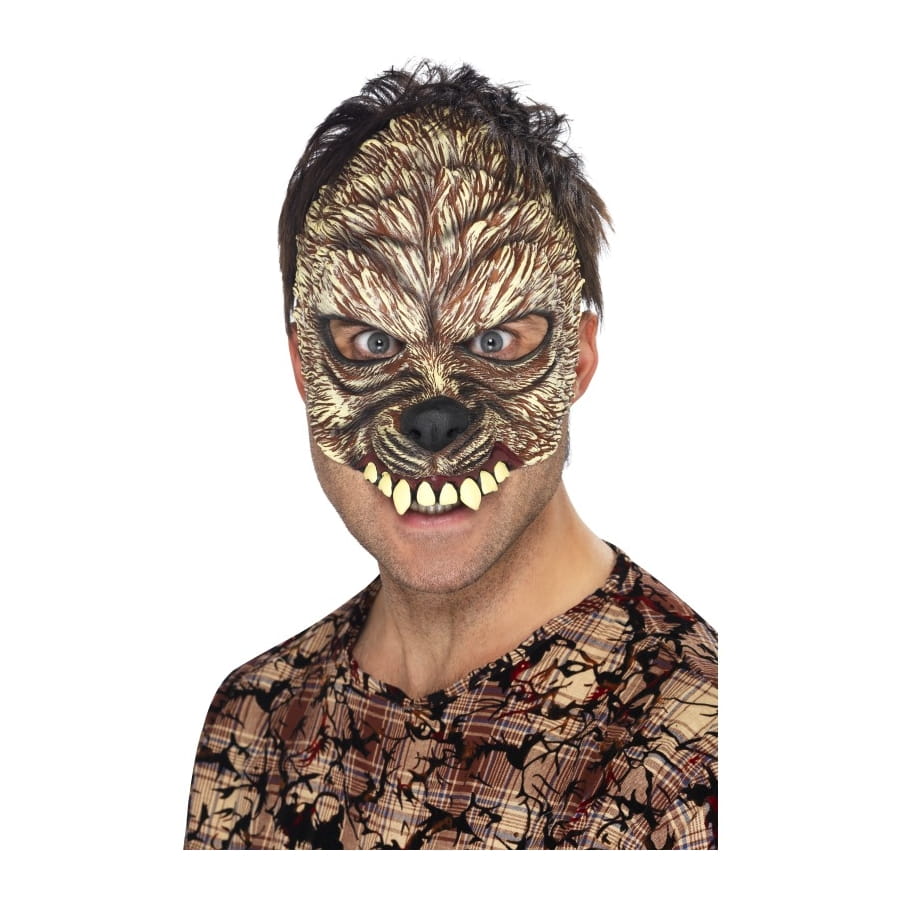 Masque demi-visage de loup-garou, pour homme. Le masque, en effet, recouvre uniquement la moitié du visage, montrant parfaitement les dents de loup-garou. Associez une tenue brune assortie pour un déguisement complet.