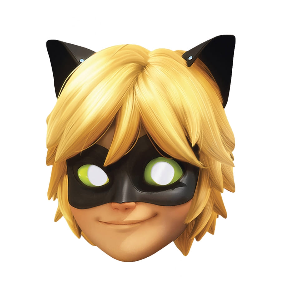 L'accessoire de déguisement est un masque représentant le visage du Chat Noir, le héros qui, avec Ladybu, partage l'affiche du populaire dessin animé Miraculous.