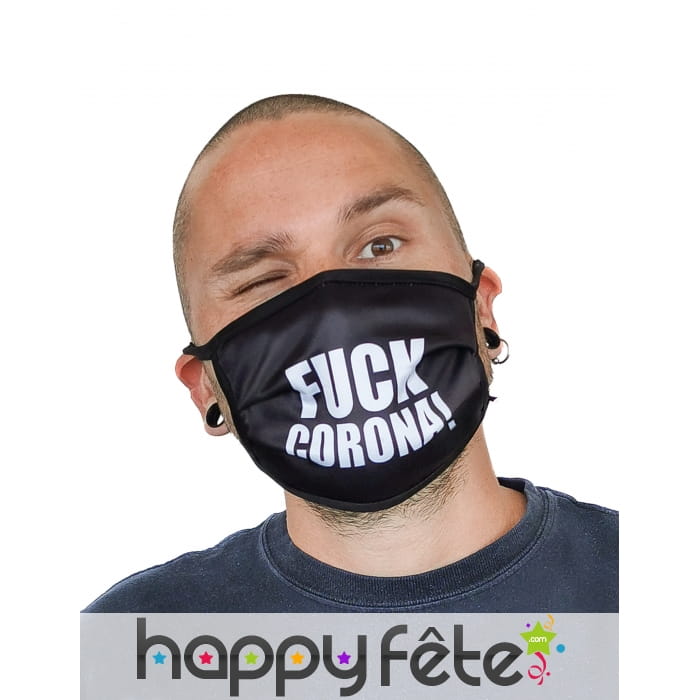De couleur noire opaque, ce masque conçu pour adulte est en tissu et présente fièrement le message imprimé "FUCK CORONA".