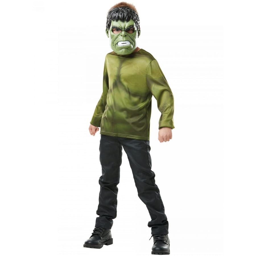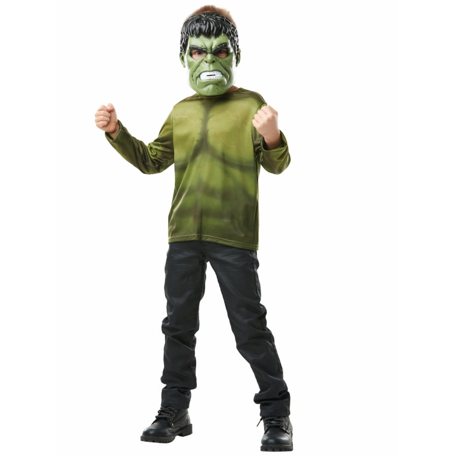 Prenez l'allure de votre superhéros favori pour votre anniversaire, avec l'ensemble masque et t-shirt vert Hulk pour enfant.
