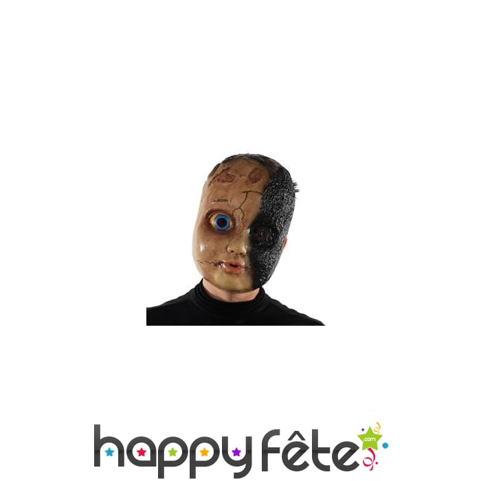 De couleur beige, il illustre un visage effrayant de poupée brûlé d'un côté.