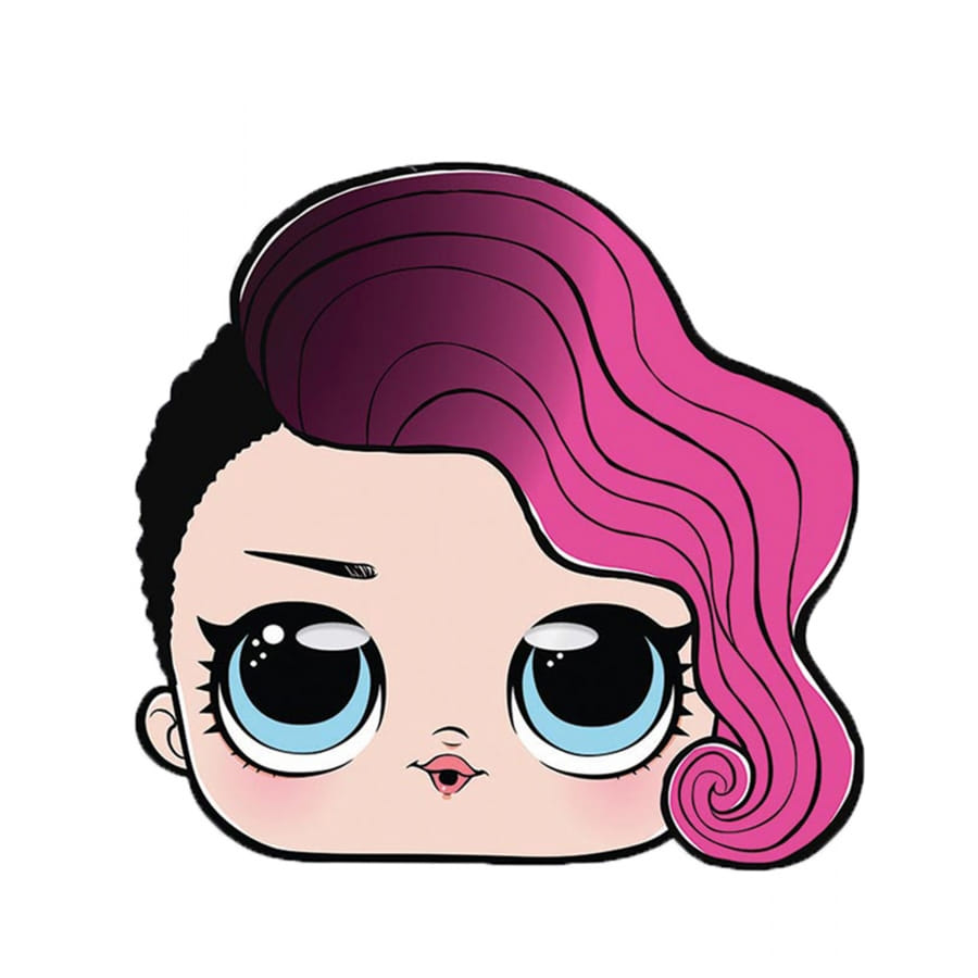 De couleur beige, il représente le visage d'une poupée aux cheveux violets.