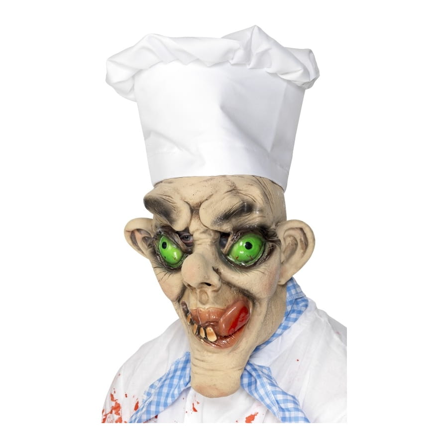 Pour halloween pourquoi ne pas revêtir ce masque horreur chef cuisinier. Vous pourrez aussi le porter pour incarner un cuisinier. Ce masque est en latex de couleur beige, les yeux sont gros et vert, il montre ses dents ainsi que sa langue.