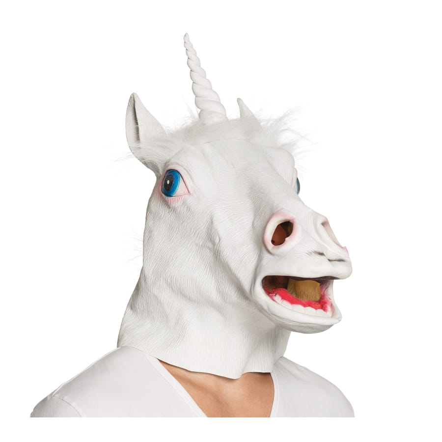 Le masque est en latex représentant entièrement et de façon ultra réaliste, la tête d'une licorne blanche aux yeux bleus et corne blanche.