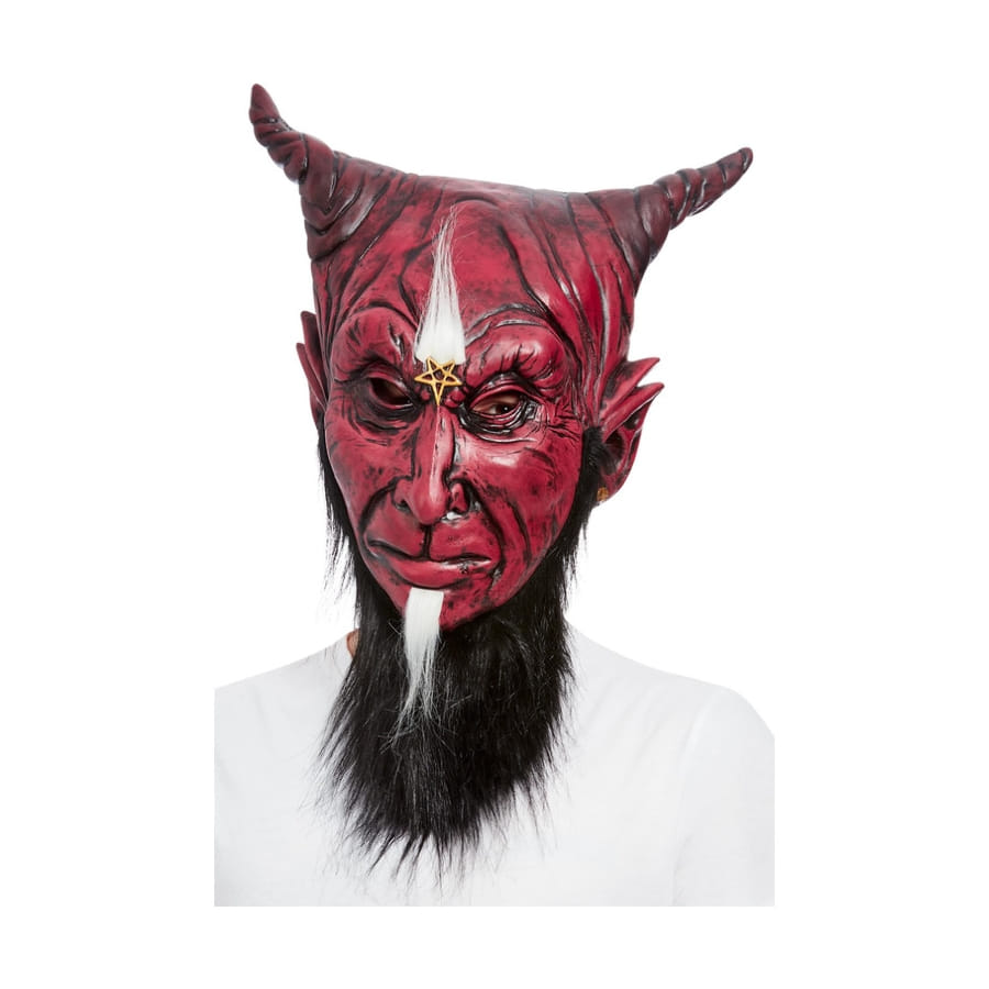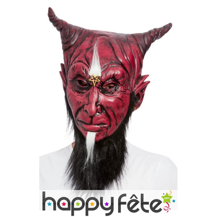 C'est un masque en latex rouge pour adulte, qui représente le visage du diable. Ce masque possède une longue barbe noire et une petite touffe blanche fixée sous la lèvre inférieure. Le masque présente 2 cornes bien ressorties, avec une double oreille sur chaque coté. Une touffe de poils blancs et un symbole satanique jaune sont visibles au niveau du front. Le masque dispose d'ouvertures au niveau des yeux, afin de faciliter la vue.