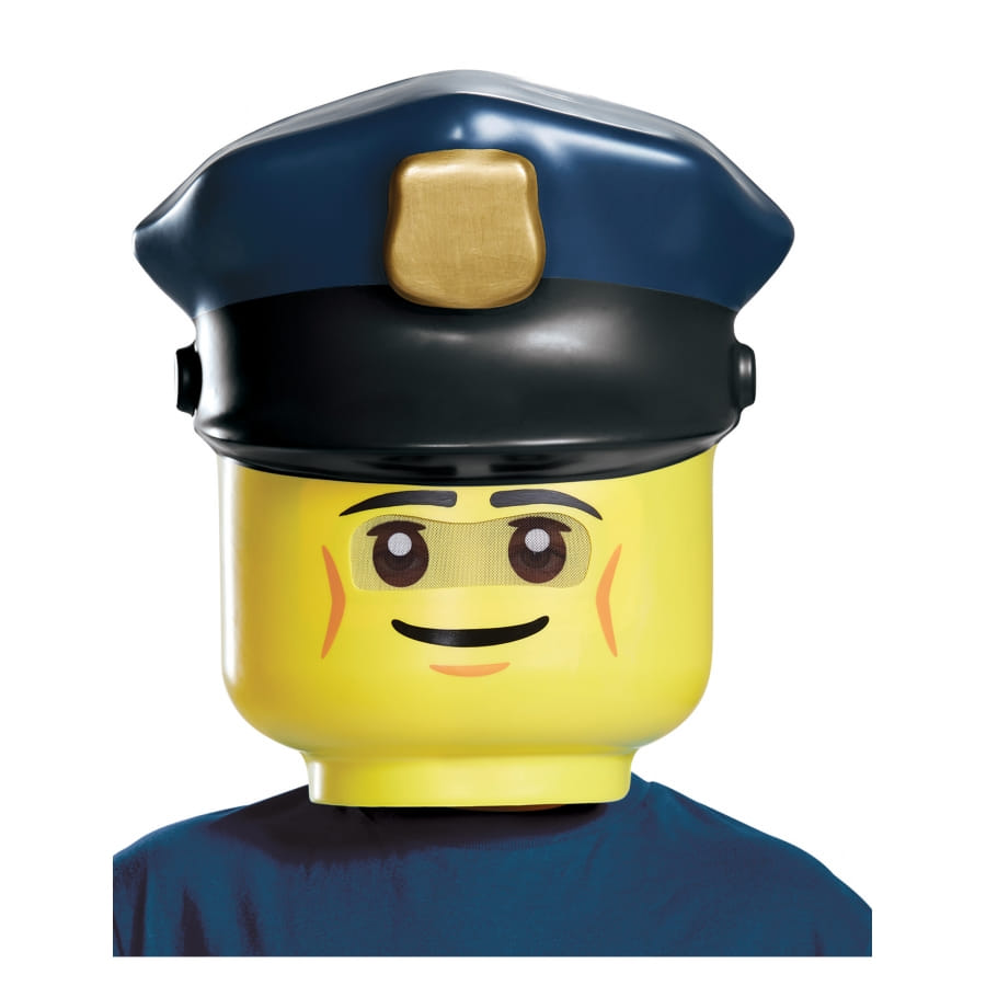 Ce Masque Lego de policier pour enfant est fait en plastique rigide et met en avant le visage jaune d'un policier revêtant une casquette bleue.