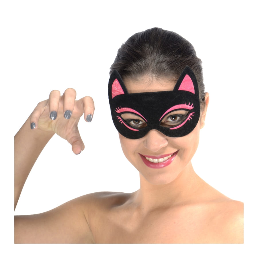 Avec ce masque loup de chat rose et noir, il vous suffira de porter une petite robe s'accordant avec les couleurs du masque pour obtenir un joli déguisement de chat. Ce loup pour femme est de couleur noir, avec des ornements en rose autour des yeux, et deux oreilles rose et noir. Il s'attachera grâce à un élastique.