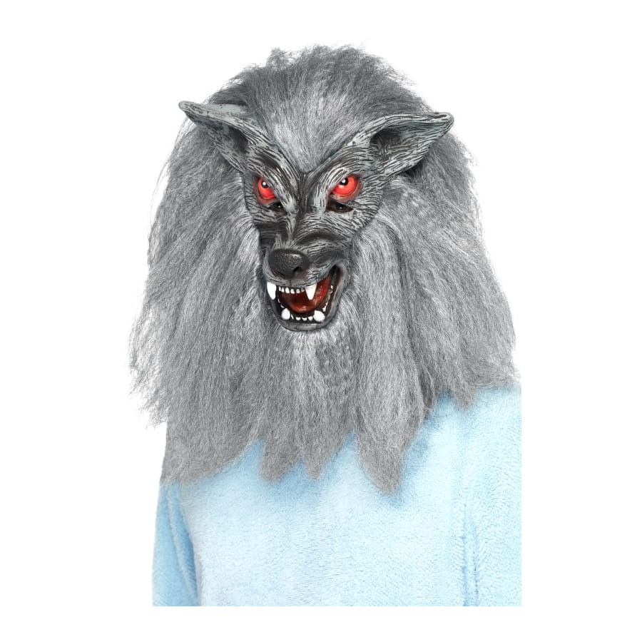 C'est avec ce masque que vous effraierez vos proches à l'occasion d'Halloween. Représentant un loup-garou sanguinaire, il est de couleur grise, comprenant des oreilles, des poils frisés, une mâchoire aux dents aiguisées et des yeux rouge sang. Il est destiné principalement aux hommes et couvre l'entièreté du crâne.