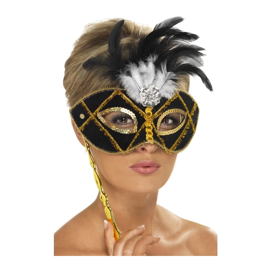 Masque "loup" de couleur noire et dorée avec stick, pour homme, femme, adolescent ou adolescente. Le masque est orné de plumes blanches et noires ainsi que de paillettes et de strass. Il vous donnera un air très glamour et élégant pour une soirée vénitienne.