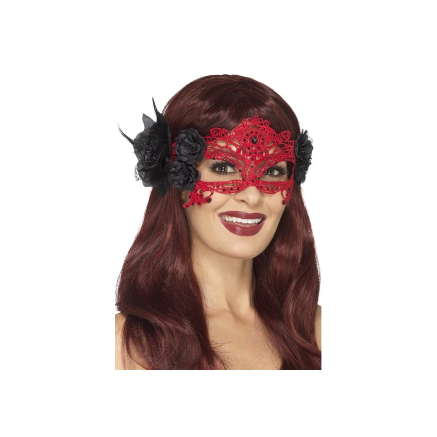Le moment n'est jamais mal choisi pour mettre à l'épreuve votre art de la séduction mesdames. En effet, même durant halloween vous aurez l'occasion de l'exercer grâce au masque loup rouge en filigrane avec roses. Avec son rouge vif dissimulant une partie de votre visage, laissez le charme de vos yeux opérer. Ce masque, soigneusement brodé est décoré de grandes roses noires comme pour rappeler le thème d'halloween.