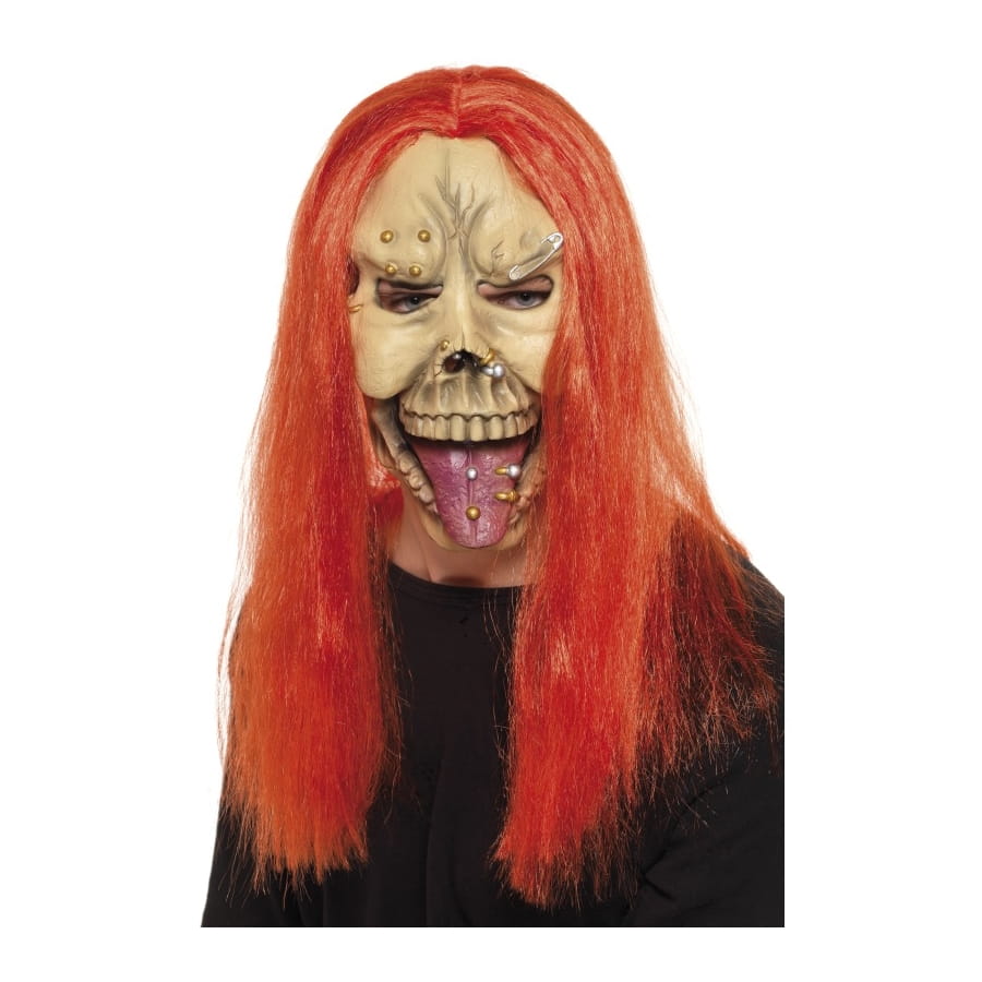 Masque de punk pour homme. Le masque est affreusement défiguré, tel un squelette, avec la langue qui sort et une multitude de piercings. Il comporte également de longs cheveux rouges lisses. Ce masque seul suffira à réaliser un déguisement d'Halloween effrayant.
