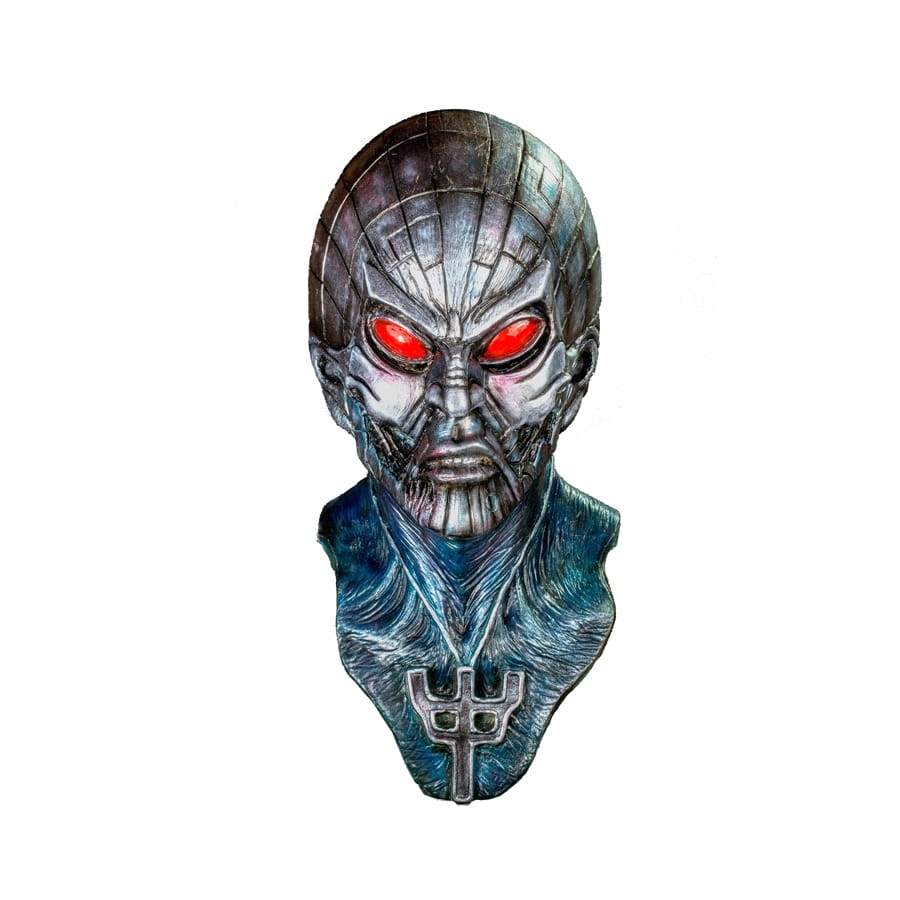 Messieurs, vous cherchez à donner plus de piquant à votre déguisement d'Alien, d'extraterrestre, ou de Rockeur martien ? Vous êtes au bon endroit ! Ce masque que vous voyez ici sera parfait pour vous. Celui-ci est inspiré du groupe heavy metal Judas Priest. Il est en latex argenté, en parfaite imitation métal, représentant une tête d'Alien avec des yeux rouges et un collier intégré. Il recouvre entièrement la tête et le cou. Il égayera certainement votre soirée Halloween avec son look terrifiant. Mais vous pourrez aussi le porter à la fête de la musique, ou à d'autres occasions, il s'adaptera à de nombreux évènements.