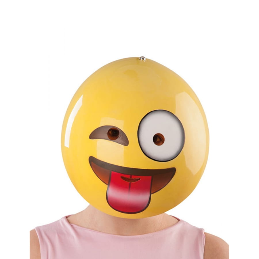 Ce masque jaune en plastique représente un visage intriguant qui fait un clin d'oeil et tire sa langue.