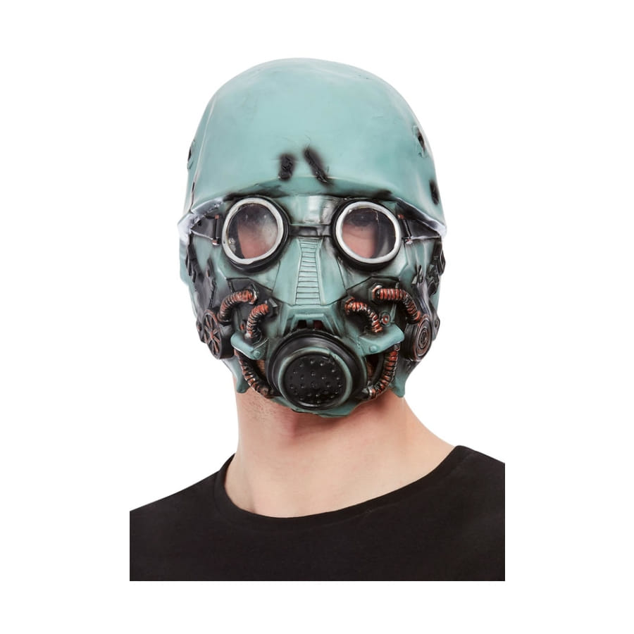 Le masque représente un casque de soldat par dessus un masque à gaz très détaillé.