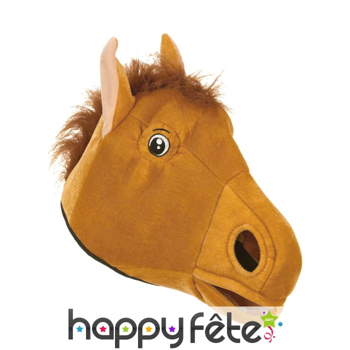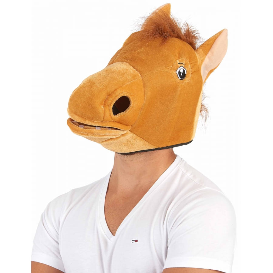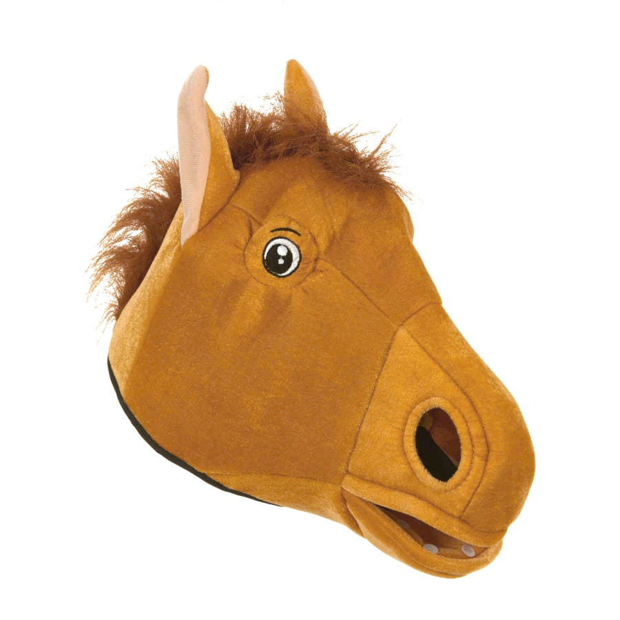 Il est question d'une masque pour adulte de couleur marron, qui représente une tête de cheval faite en tissu pelucheux rembourré.