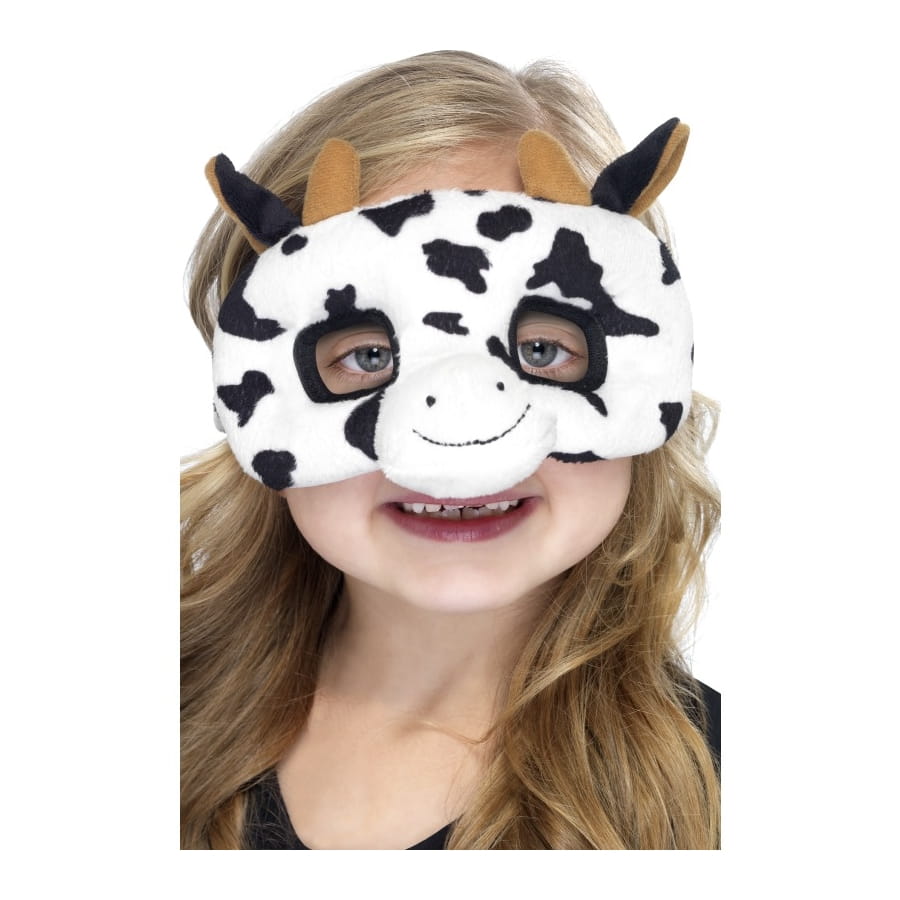 Masque de vache pour fille ou garçon. Le masque est blanc, avec des tâches noires, des oreilles noires et de petites cornes marrons. Si votre enfant adore les vaches, c'est l'occasion de lui permettre de se transformer en son animal favori.