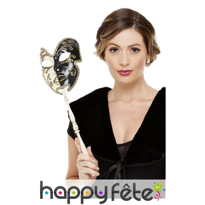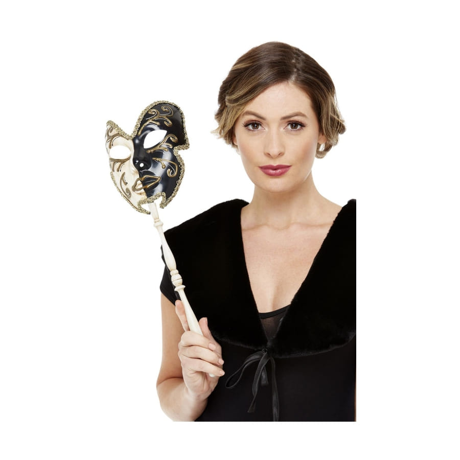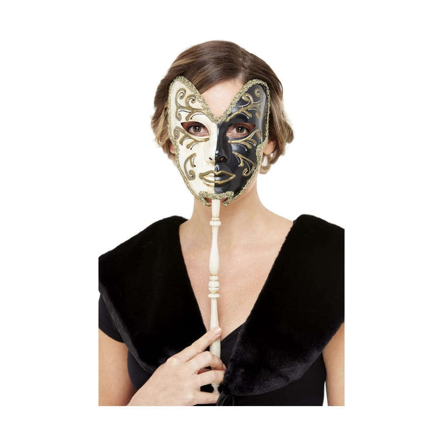 Ce Masque vénitien beige et noir avec baton sera idéal pour agrémenter votre costume d'apparat lors d'une soirée déguisée.