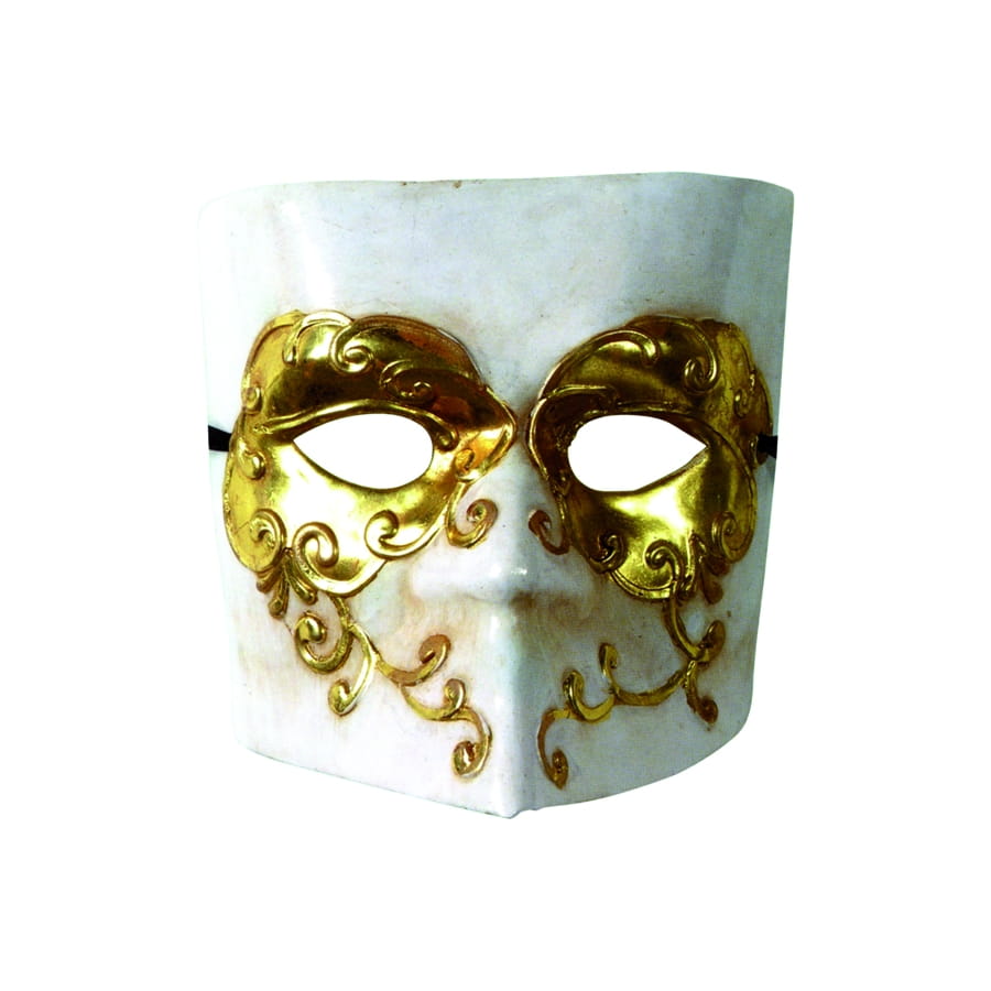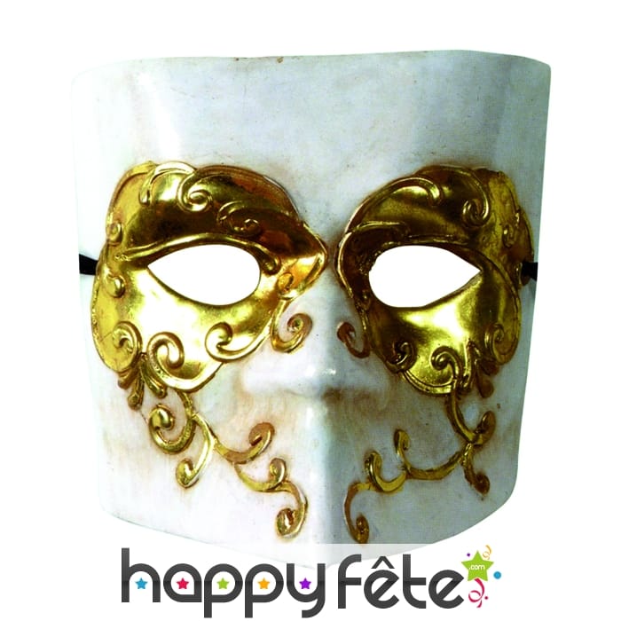 Pour être encore plus mystérieux ce masque vénitien apportera son lot de mystère et de charme. Pour homme comme pour femme, il est en papier mâché et vous accompagnera pour une fête ayant pour thème Italie, Venise ou selon votre choix. De couleur blanc, il y a des motifs dorés sur le masque autour des yeux et descendand sur la joue pour rejoindre la bouche.