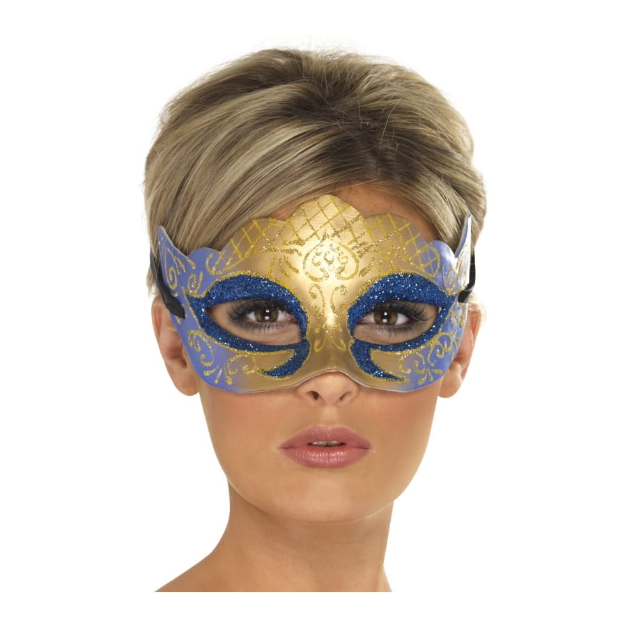 Masque vénitien de Colombine, pour femme. Ce masque est de couleur dorée et bleue, avec de jolies paillettes autour des yeux. Ornez votre visage de ce masque pour devenir une jolie étrangère à l'occasion d'un bal masqué.